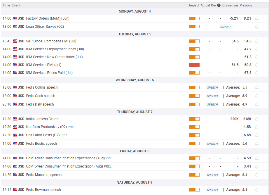 The Institute for Supply Management (ISM) will publish Services Purchasing Managers Index (PMI) data for July on Tuesday. In case the headline PMI comes in below 50 and points to a contraction in the service sector’s business activity, the USD could have a hard time outperforming its rivals, allowing XAU/USD to hold its ground. On the other hand, a reading above 50, combined with an improvement in the Employment Index of the survey, could boost the USD with the immediate reaction.