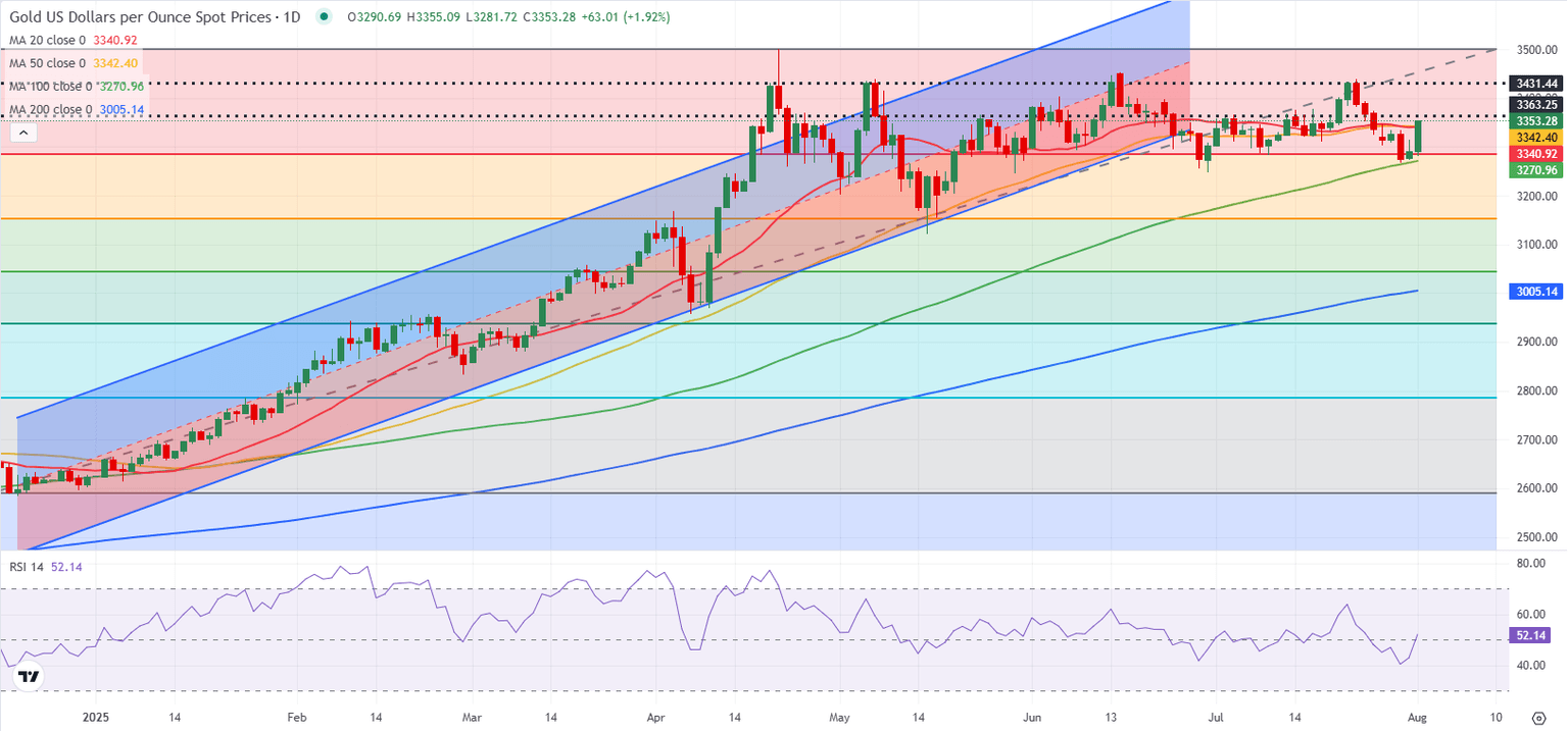Although Gold staged a rebound on Thursday, it failed to gather bullish momentum and stabilized near $3,300, with investors moving to the sidelines ahead of the July employment report from the US.