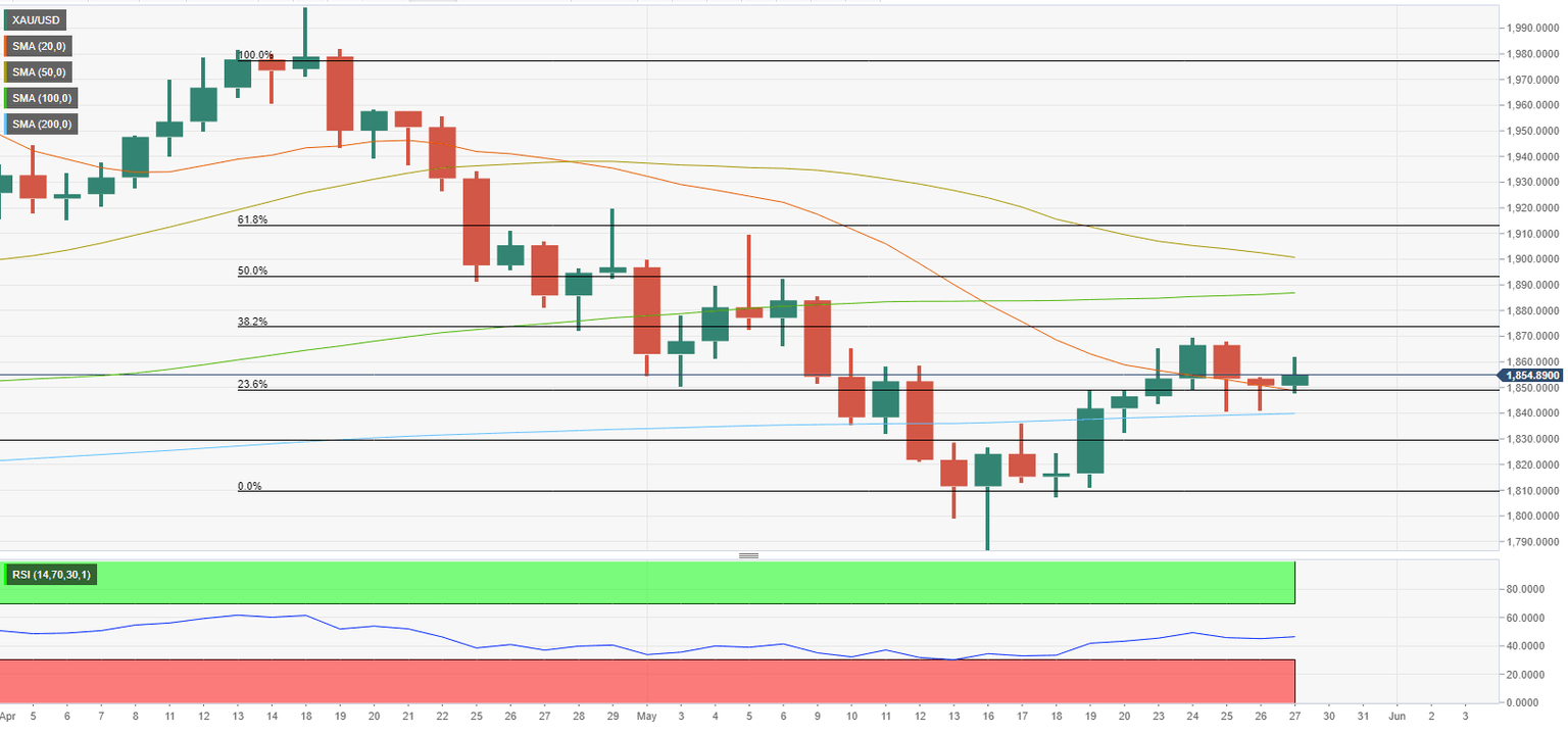 With the benchmark 10-year US Treasury bond yield edging lower toward 2.7% on Friday, gold regained its traction and climbed to the $1,860 area. Moreover, the 200-day SMA stayed intact following the downward correction, allowing buyers to retain control of XAUUSD’s price action.