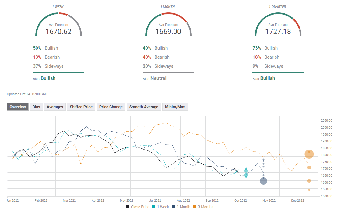 Half of the experts polled by FXStreet expect gold to stage a rebound next week with the average one-week target aligning at $1,670. The one-month view paints a mixed picture but the one-quarter outlook shows that a majority of experts project the yellow metal to be above $1,700 by the end of the year.