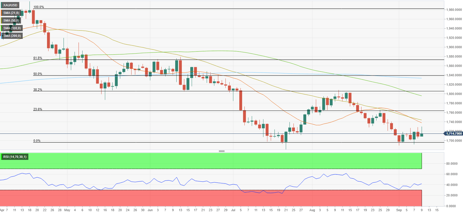 On the upside, $1,740 (20-day SMA, 50-day SMA) aligns as key resistance. With a daily close above that level, additional gains toward $1,760 (Fibonacci 23.6% retracement of the latest downtrend) and $1,790 (100-period SMA) could be witnessed.