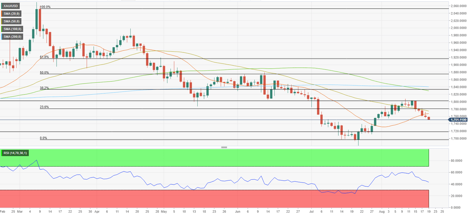 On Wednesday, the data from the US revealed that Retail Sales remained unchanged on a monthly basis in July. This reading failed to trigger a significant market reaction. Later in the day, the FOMC's July meeting minutes revealed some participants said the policy rate would have to reach a 'sufficiently restrictive' level and remain there 'for some time' to control inflation. Since the Fed's publication didn't include policymakers' views on the latest inflation and employment data, it was largely ignored by market participants. Nevertheless, with the benchmark 10-year US Treasury bond yield rising more than 3% mid-week, gold extended its slide toward $1,760.