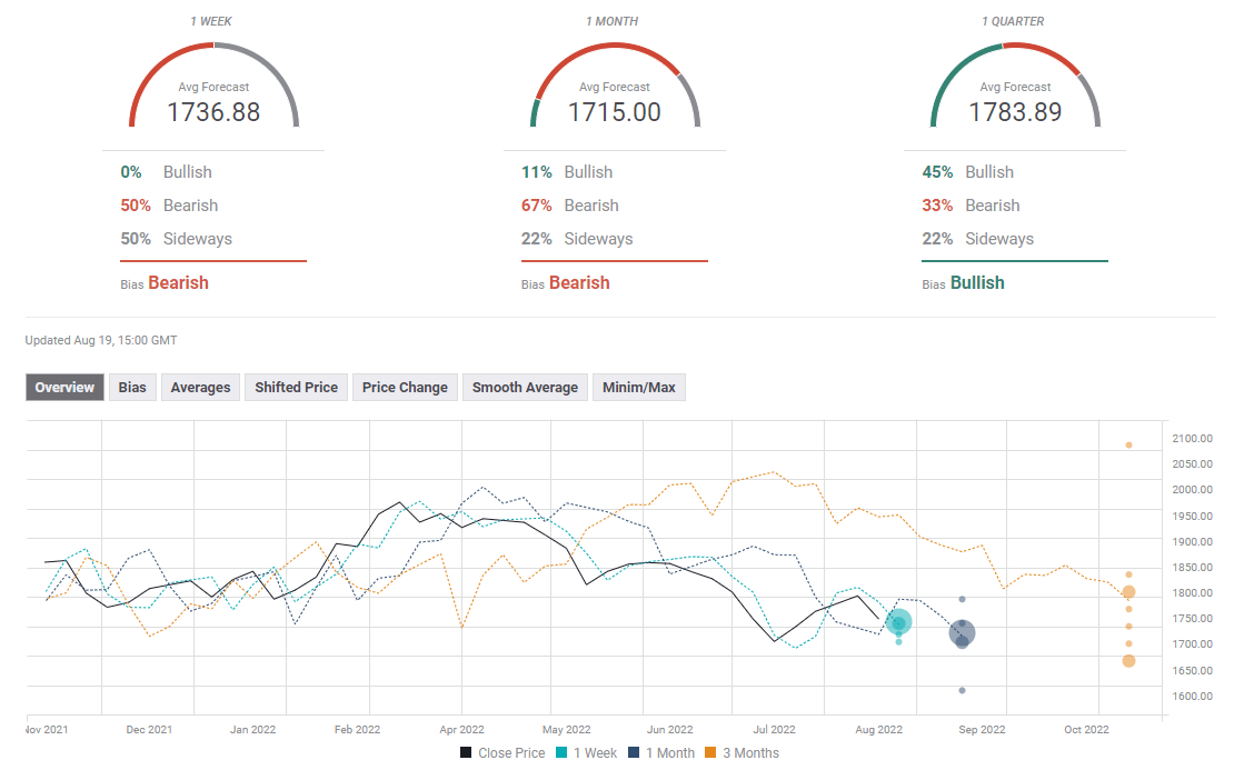 Half of the experts polled by FXStreet expect gold to continue to push lower while the other half see it consolidating its losses. The one-week average price target sits at $1,736. On the one-month view, the bearish bias stays intact with several experts forecasting gold to drop to $1,700.