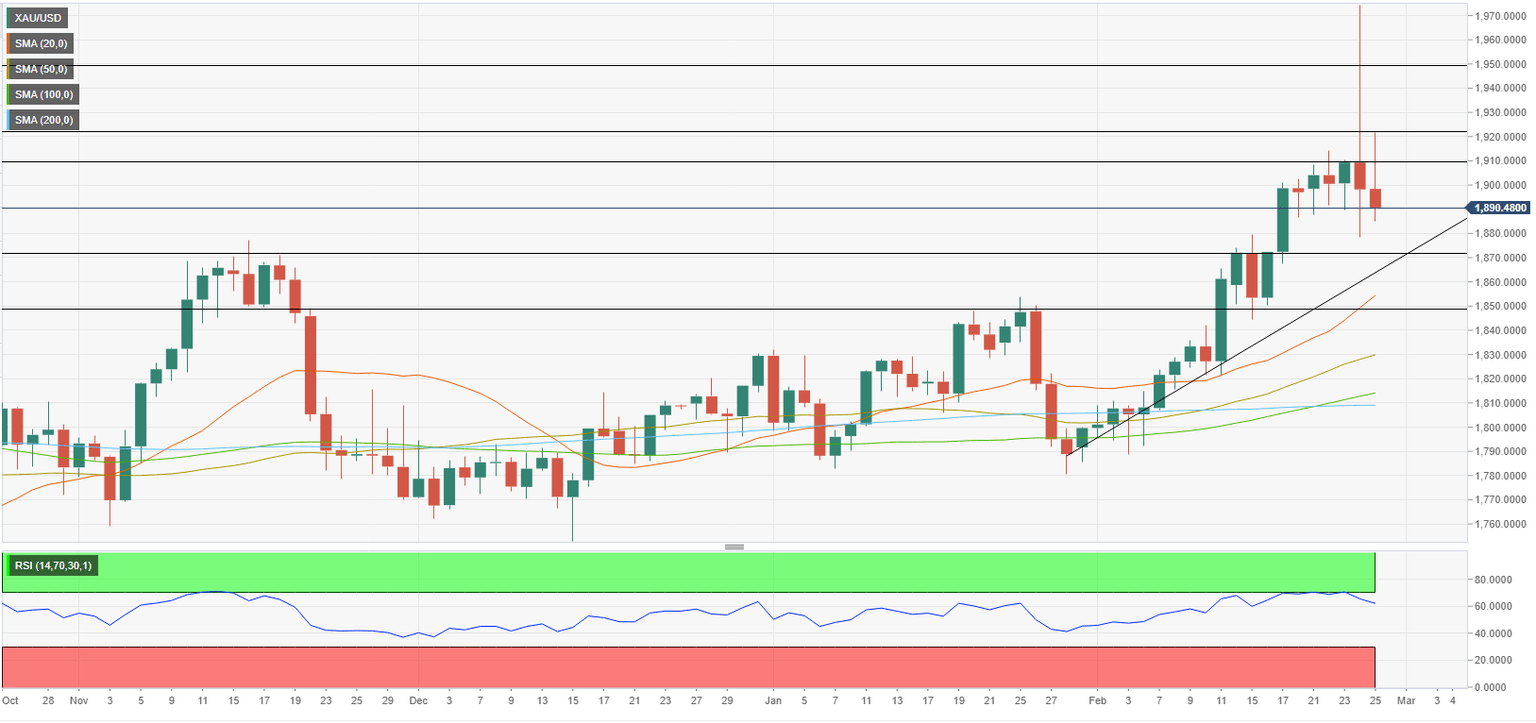 On Friday, reports of Russian forces moving toward the Ukrainian capital of Kyiv with the intention of overthrowing the government forced markets to adopt a cautious stance. The yellow metal spent the first half of the day in a relatively tight range above $1,900. In the early American session, reports of Russia willing to send a delegation to Minsk for talks with Ukraine revived optimism for a diplomatic end to war. XAU/USD came under bearish pressure on this development and continued to push lower.