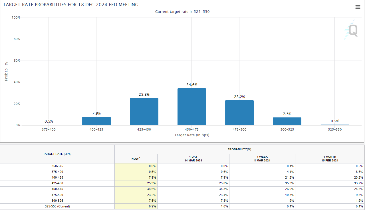 In December, the dot plot showed that Fed policymakers were forecasting a total of 75 basis points (bps) of rate cuts in 2024. The CME FedWatch Tool shows that markets are pricing in a nearly 70% probability that the policy rate will be lowered by at least 75 bps after the Fed’s policy meeting in December.