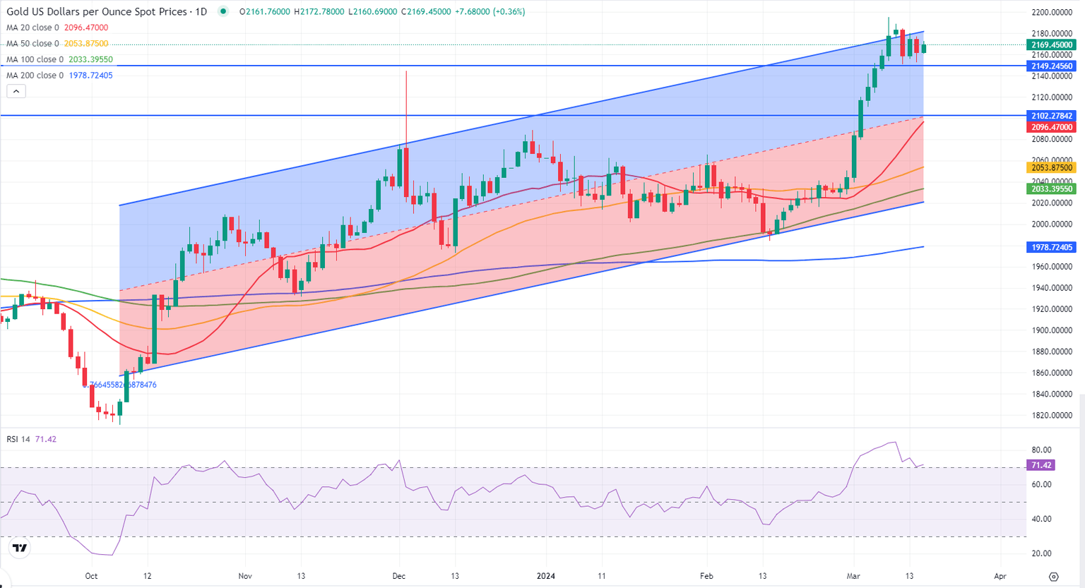The BLS said on Thursday that the annual Producer Price Index (PPI) rose 1.6% in February, following the 1% increase recorded in January and surpassing the market expectation of 1.1% by a wide margin. Other data from the US showed that Retail Sales increased 0.6% on a monthly basis in February after falling 1.1% in January, while the number of first-time applications for unemployment benefits edged lower to 209,000 in the week ending March 9 from 210,000. Following these data releases, investors started reassessing the timing of the Federal Reserve (Fed) policy pivot. According to the CME FedWacth Tool, the probability of the Fed leaving the policy rate unchanged at 5.25%-5.5% range in June climbed to 40% from below 30% ahead of the data. The 10-year US yield extended its uptrend and advanced to its highest level in two weeks at 4.3%. In turn, Gold came under renewed bearish pressure and dropped below $2.160.