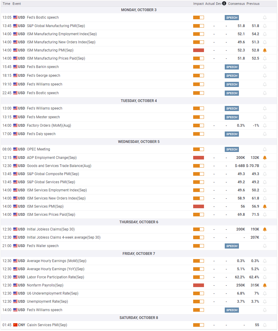 - ISM PMI surveys and September jobs report will be featured in the US economic docket.