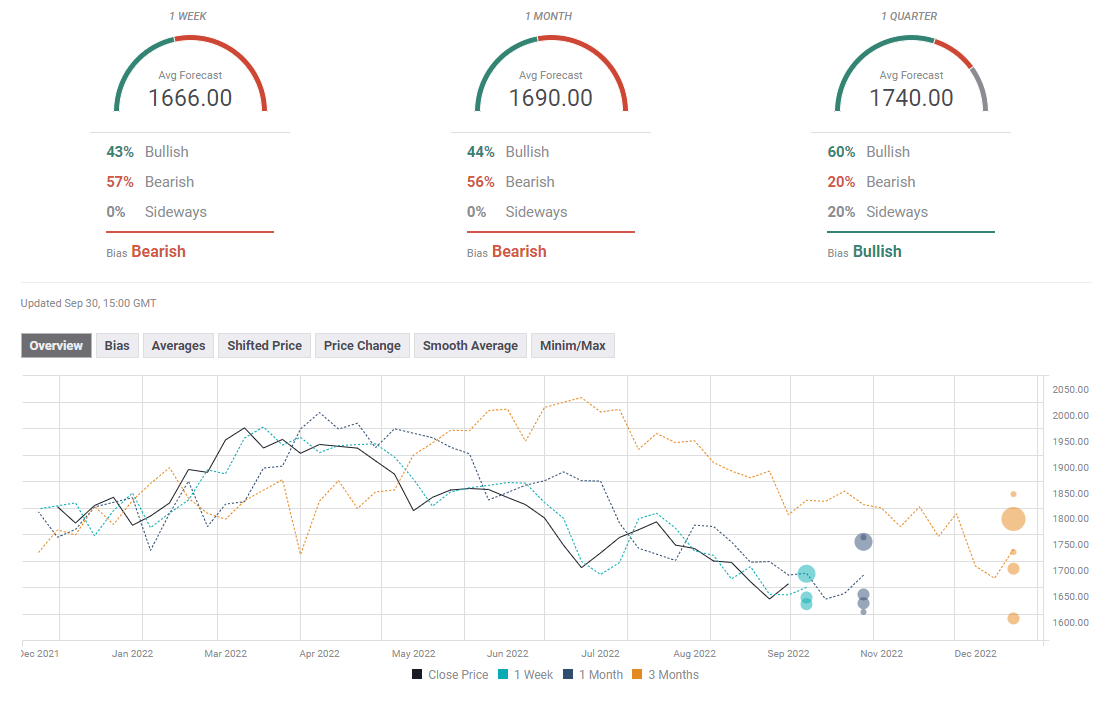 The FXStreet forecast poll paints a mixed picture for gold in the one-week and one-month outlooks. Average targets for these time periods are located at $1,666 and $1,690, respectively.