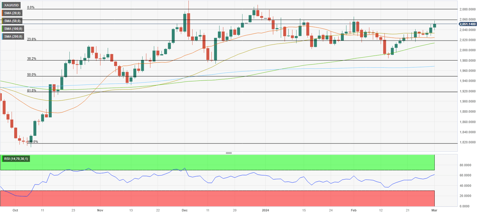 On the upside, $2,060 (static level) aligns as interim resistance ahead of $2,080 (end-point of the October - December uptrend) and $2,100 (psychological level). In case XAU/USD returns below $2,035 (50-day SMA), $2,020 (100-day SMA, Fibonacci 23.6% retracement) could be seen as important support levels before sellers could target $2,000 (psychological level, static level).