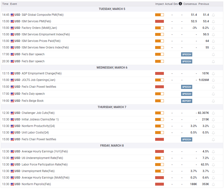 On Tuesday, the ISM Services PMI will be featured in the US economic docket. The headline PMI is forecast to hold above 50 in February and highlight an ongoing expansion in the service sector’s business activity. In January, the Prices Paid Index of the PMI survey jumped to 64 from 56.7 in December, showing an acceleration in the input cost inflation. A similar increase in the inflation component in February could provide a boost to the USD and weigh on XAU/USD with the immediate reaction.