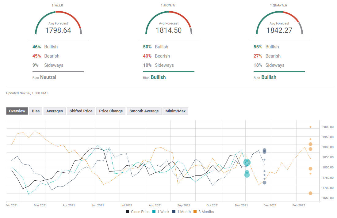 The FXStreet Forecast Poll shows that gold is expected to stay in a consolidation phase around $1,800 in the near term. The one-month outlook points to a slightly bullish bias.