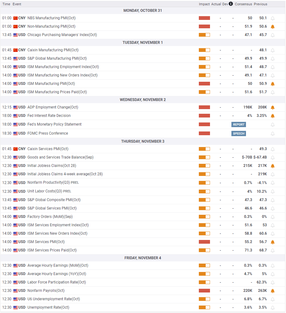 The Fed is widely expected to raise its policy rate by 75 bps to the range of 3.75%-4% following its November policy meeting. Although FOMC policymakers said numerous times that they will base their policy decisions on incoming data and will not be providing any forward guidance, investors will look for hints of a smaller hike in December, as the WSJ article suggested. Currently, the CME Group’s FedWatch Tool shows that markets are pricing in a 51.5% probability of the Fed hiking its policy rate by a total of 125 bps by end-2022. The market positioning demonstrates that the dollar has more room on the downside in case investors are convinced that the Fed will opt for a 50 bps hike in December. In that scenario, XAU/USD is likely to gather bullish momentum alongside falling US yields. Furthermore, a risk rally could be triggered with markets starting to price in a peak Fed hawkishness, putting additional weight on the USD.