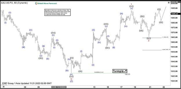 Rally from 9.28.2022 low is currently in progress as a 5 waves Elliott Wave impulse structure. Up from 9.28.2022 low, wave (1) ended at 2081.82 and pullback in wave (2) ended at 1810.58. The metal has resumed higher in wave (3). Internal subdivision of wave (3) is unfolding as another impulsive structure in lesser degree. Up from wave (2), wave ((i)) ended at 1941.95 and wave ((ii)) ended at 1931.4. Wave ((iii)) higher ended at 1975.30 and dips in wave ((iv)) ended at 1955.33.