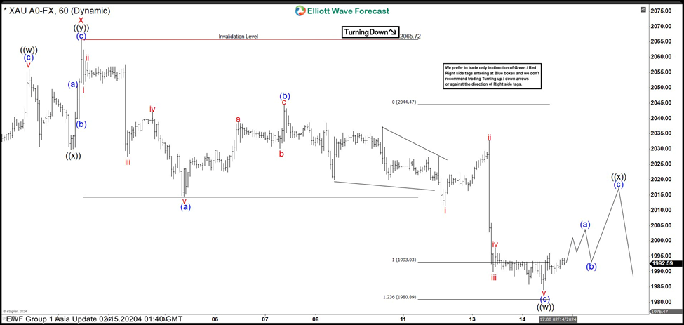 Gold (XAUUSD) cyclc from 12.28.2023 high is in progress as a double three Elliott Wave structure. Down from 12.28.2023 high, wave W ended at 2001.6 and rally in wave X ended at 2065.6. The metal then turns lower again in wave Y. Wave Y subdivides into another double three in lesser degree. Down from wave X, wave i ended at 2051 and wave ii ended at 2058.70. Wave iii lower ended at 2027.6, wave iv ended at 2042.22, and wave v lower ended at 2014.50. This completed wave (a) in higher degree. Rally in wave (b) ended at 2044.55 as a zigzag. Up from wave (a), wave a ended at 2038.8 and wave b ended at 2030.2.