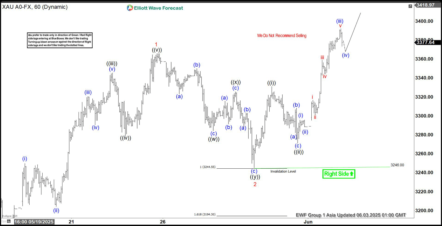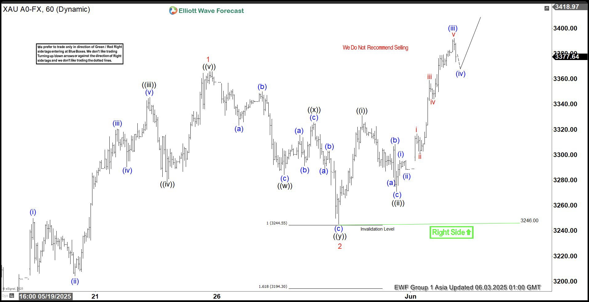 Gold (XAUUSD) has displayed a strong bullish trend since establishing a low on May 15, 2025, forming a sequence of higher highs that signals further upside potential. The rally from the May 15 low unfolded in a clear five-wave Elliott Wave structure, completing wave 1 at $3365.93. The initial advance, wave ((i)), peaked at $3252.05, followed by a corrective pullback in wave ((ii)) to $3153.47. The subsequent rally in wave ((iii)) reached $3345.40, with a minor dip in wave ((iv)) to $3278.79. A final leg, wave ((v)), concluded wave 1 at $3365.93.