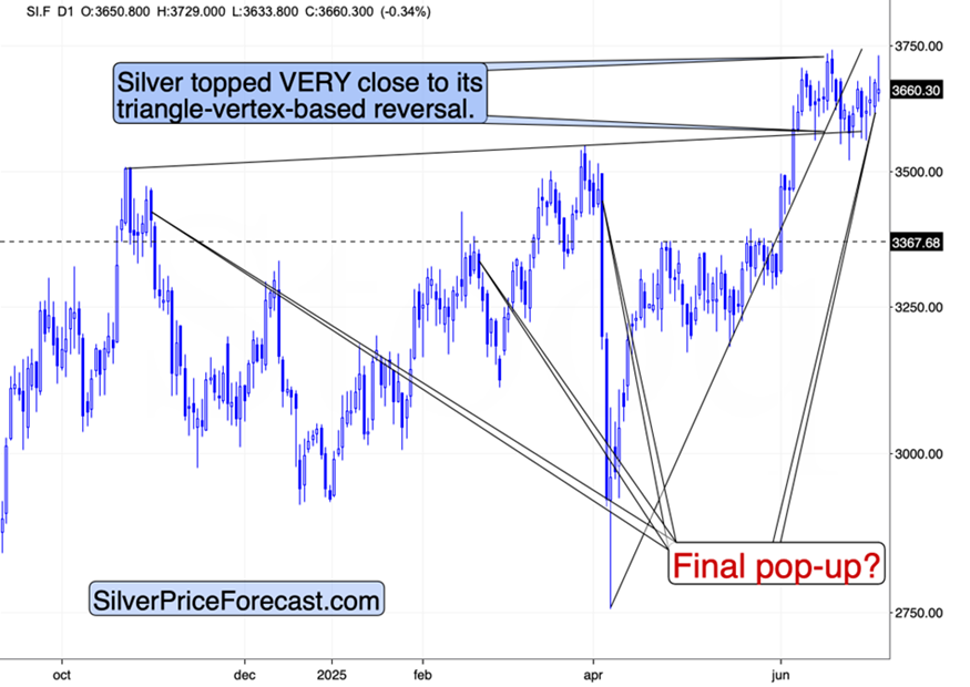 Gold’s technical picture didn’t change. What silver is doing is aligned with the “story”. And miners did very little yesterday. After the initial move lower, they ended less than 1% higher. Again, that’s typical topping behavior.