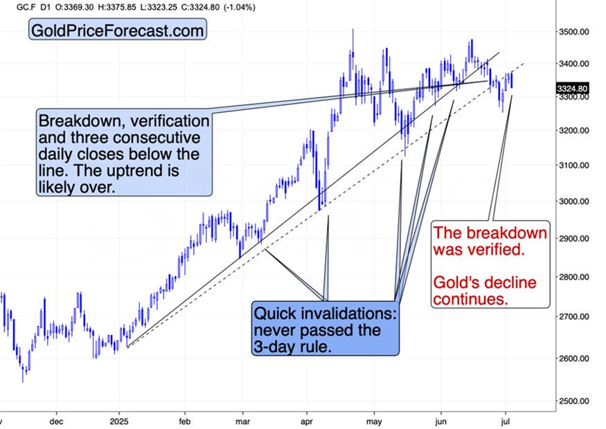 Gold verified the breakdown below its rising support/resistance line, and now it’s moving back down – another classic technical move.
