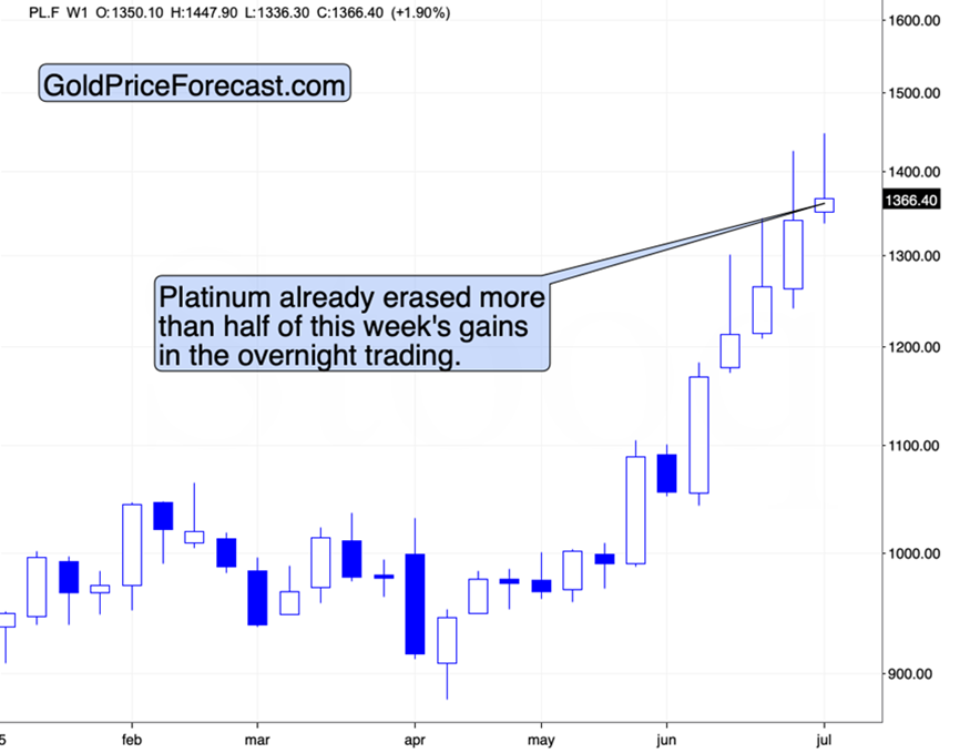 Platinum soared yesterday and while it’s already down today (pretty much erasing yesterday’s rally and forming a shooting star candlestick), yesterday’s upswing showed just how strong the emotional reaction was.