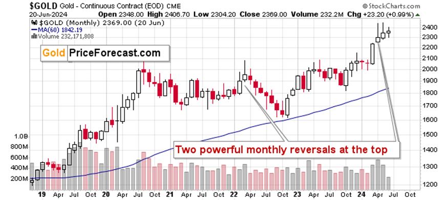 Let’s start off with gold’s monthly chart (based on monthly candlesticks), where you can see that gold formed two monthly reversals in April and May.