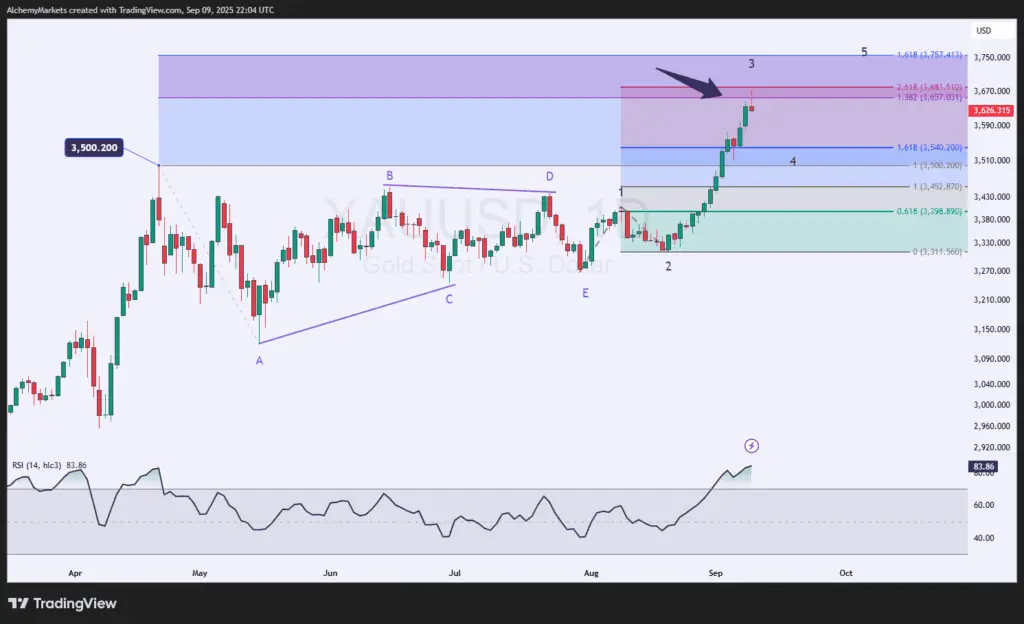 - Trend bias: Gold (XAUUSD) has been rallying higher in wave 3 of (5) after a triangle break.