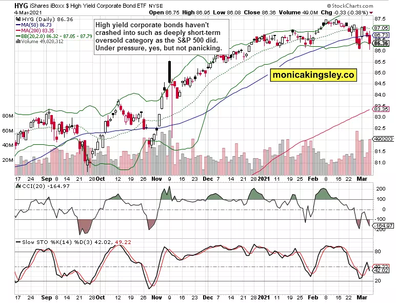 High yield corporate bonds (HYG ETF) haven‘t declined below last week‘s lows, and are still at bullish divergence readings. Will they keep above these? Doing so is essential for the still unfolding S&P 500 correction.