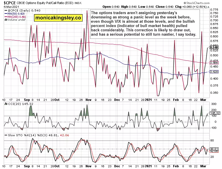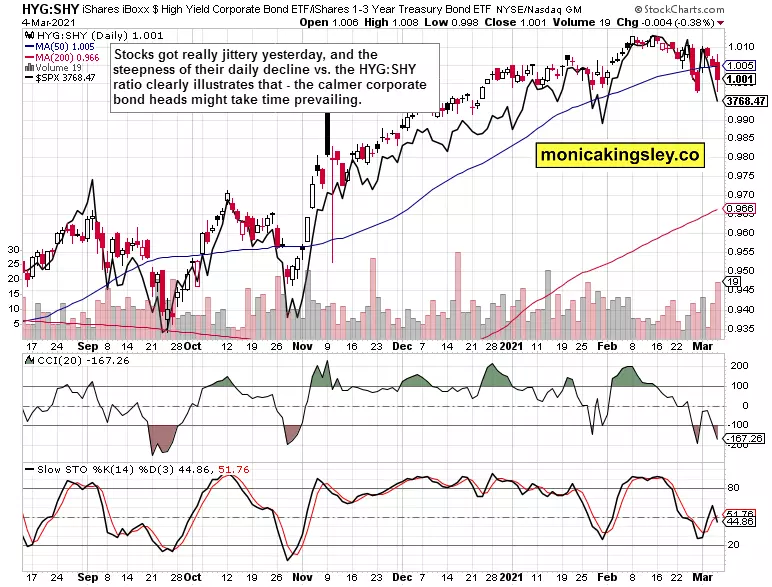 The put/call ratio is well below the Feb or Jan highs, while the volatility index is much higher relatively to these. While that‘s an opportunity for even more panic, volatily would quickly die down if today‘s S&P 500 upswing sticks. Then, it would be time to evaluate the changes in posture. Either way, this correction appears to have longer to run still.