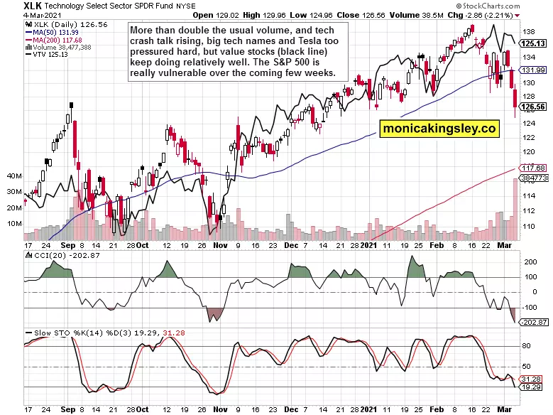 Powell gave a wait-and-see answer to my yesterday‘s rhetorical question about the bears just starting out, indeed. The S&P 500 plunged, breaking far outside the Bollinger Bands confines, illustrating the extraordinary nature of the move. Rebound would be perfectly natural here (and we‘re getting one as we speak) –" but will it be more than a dead cat bounce?