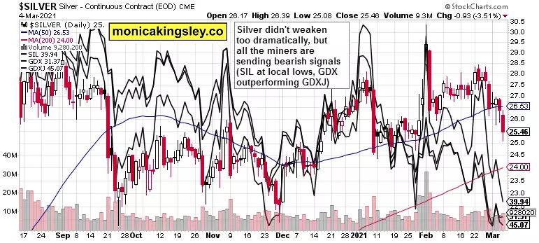 Silver is in a technically stronger position, but signs of deterioration are creeping here too. It‘s painfully obvious when the miners are examined –" the silver ones are leading to the downside, and the gold ones, well seniors outperforming juniors isn‘t a sign of strength really. The sky isn‘t definitely clear here.