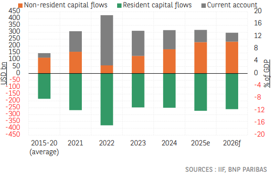 According to estimates from the Institute for International Finance, net resident capital outflows from the Gulf reached USD 271 billion in 2025, while net non-resident capital inflows amounted to USD 228 billion.