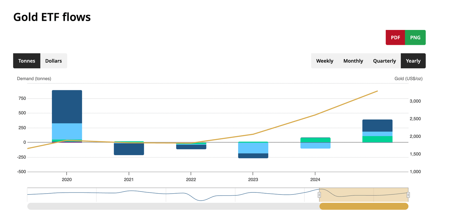 Through the first half of 2025, gold-backed funds globally increased their holdings by 397.1 tonnes.