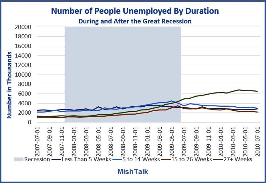 - The number of people unemployed for 15-26 weeks in the Great Recession peaked at 3,488,000 in June of 2009. That's when the recession ended.