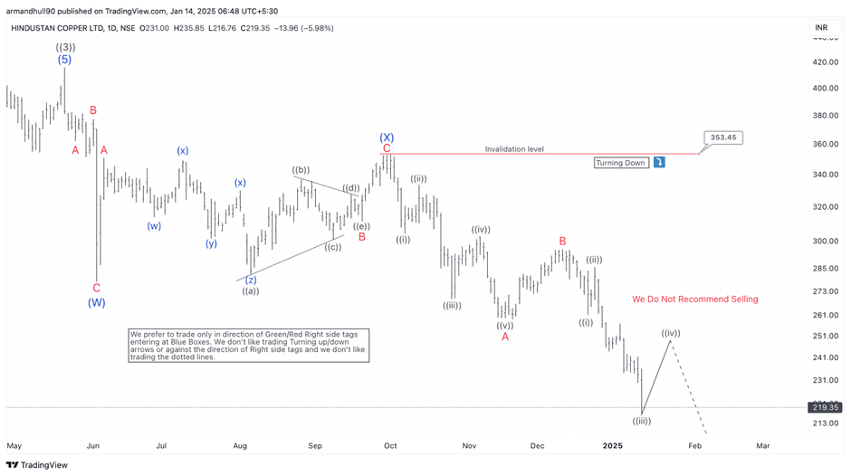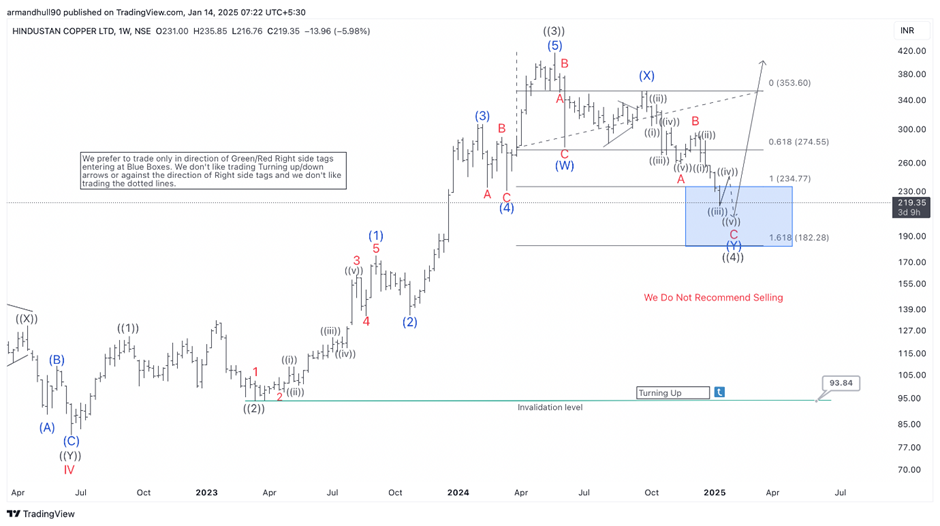 The Elliott Wave analysis for Hindustan Copper Ltd. (NSE) indicates a correction on the weekly chart. The broader structure follows a five-wave sequence, with waves ((1)) and ((3)) already completing their upward moves. Currently, wave ((4)) is unfolding as a double zigzag pattern (W-X-Y). Wave (Y) aims for the area of 1 and 1.618 Fibonacci extension of wave (W), between 234 and 182 INR.