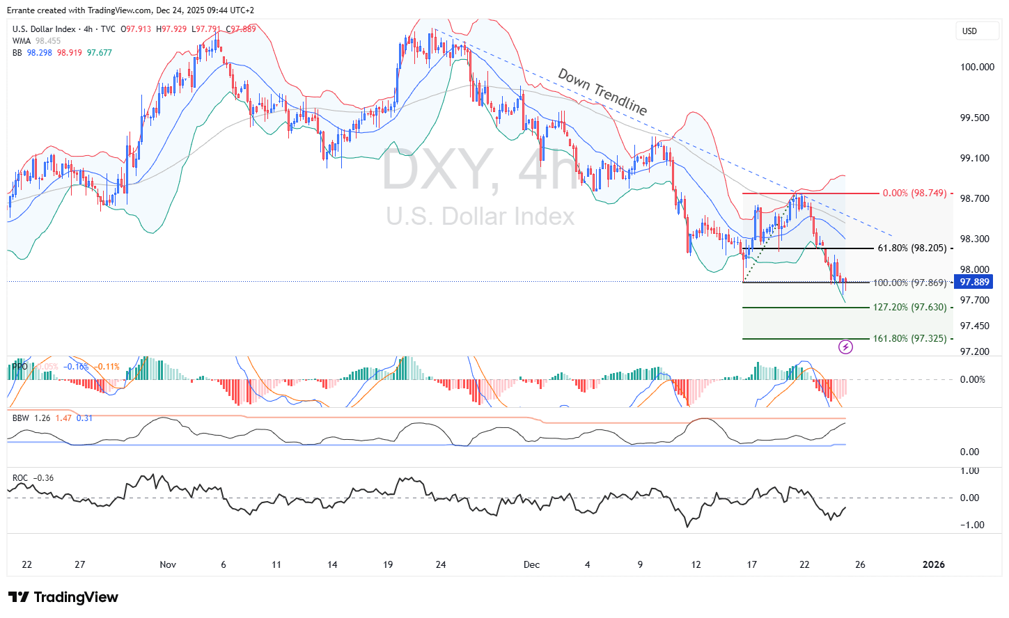 Technically, DXY is trading around 97.889 and has broken below the 100% retracement marker at 97.869, keeping the near-term structure bearish under the downtrend line. The next downside checkpoints are 97.630 (127.2%) and 97.325 (161.8%).