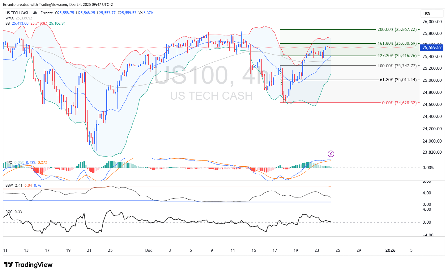US100 (H4): Growth optimism plus holiday liquidity keeps the grind higher