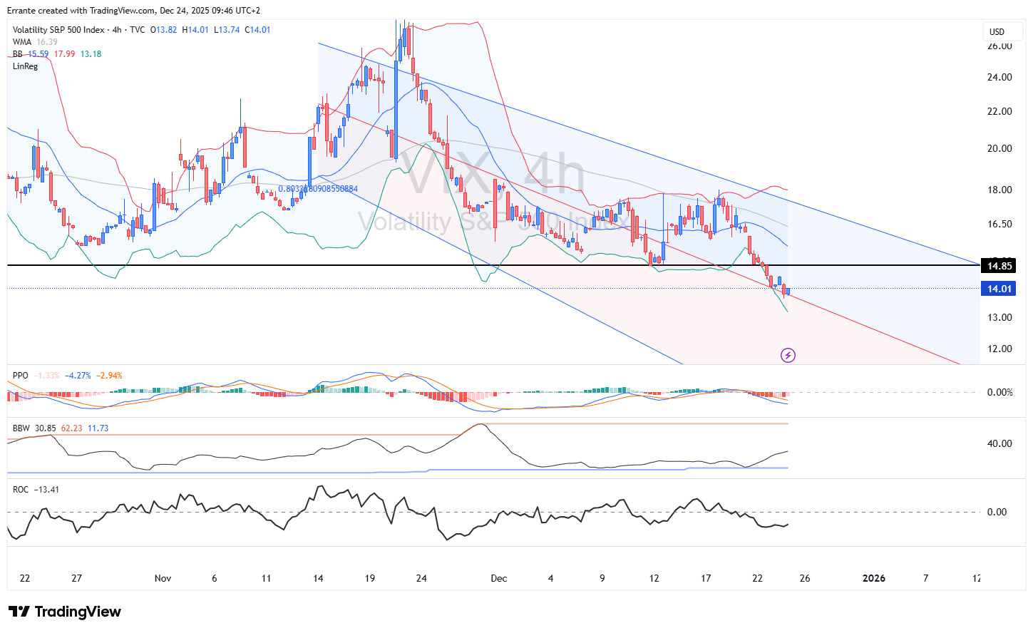 The market is pricing calm; VIX is around 14.01 and remains below its 16.39 WMA, consistent with stable risk appetite and suppressed hedging demand into the holiday.