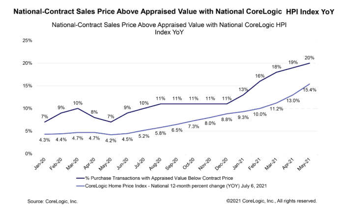 20% of sales are above the appraised value. That figure is from the July Corelogic article Appraisal Gap Increases in “Hot” Markets