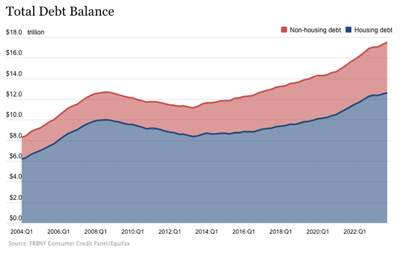 Household debt rose by another $212 billion in the fourth quarter of 2023, surging to a record $17.5 trillion, according to the latest data from the New York Fed.