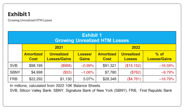 Before it decided to sell its devalued bonds, SVB had substantial unrealized losses on its HTM portfolio, as did Signature and First Republic. Had these unrealized losses been reported, observers might have realized the banks were in trouble earlier.