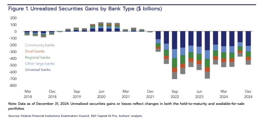 Unrealized losses are a ticking time bomb underneath U.S. commercial banks. As of December 31, 2024, there were roughly $482 billion in unrealized losses across both AFS and HTM bond portfolios. However, much of this is hidden on individual bank income statements because they have marked their bonds “hold-to-maturity.”