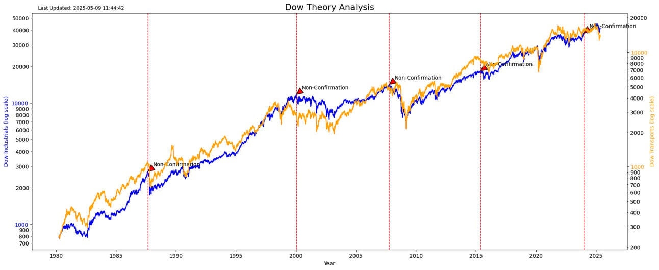 Dow Theory tops are called when one of the indexes, the Dow Jones Industrial or the Dow Jones Transports, doesn’t confirm a new high. I programmed the analysis with a non-confirmation signal last year.