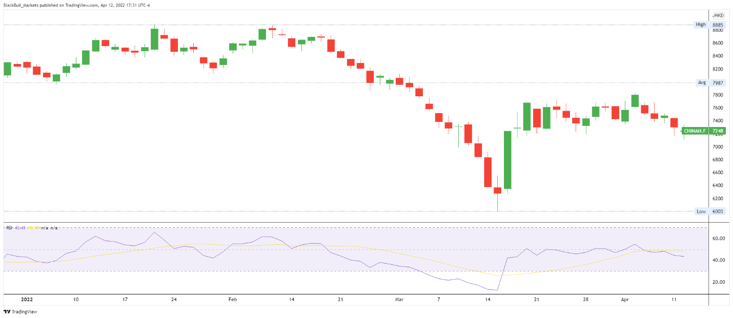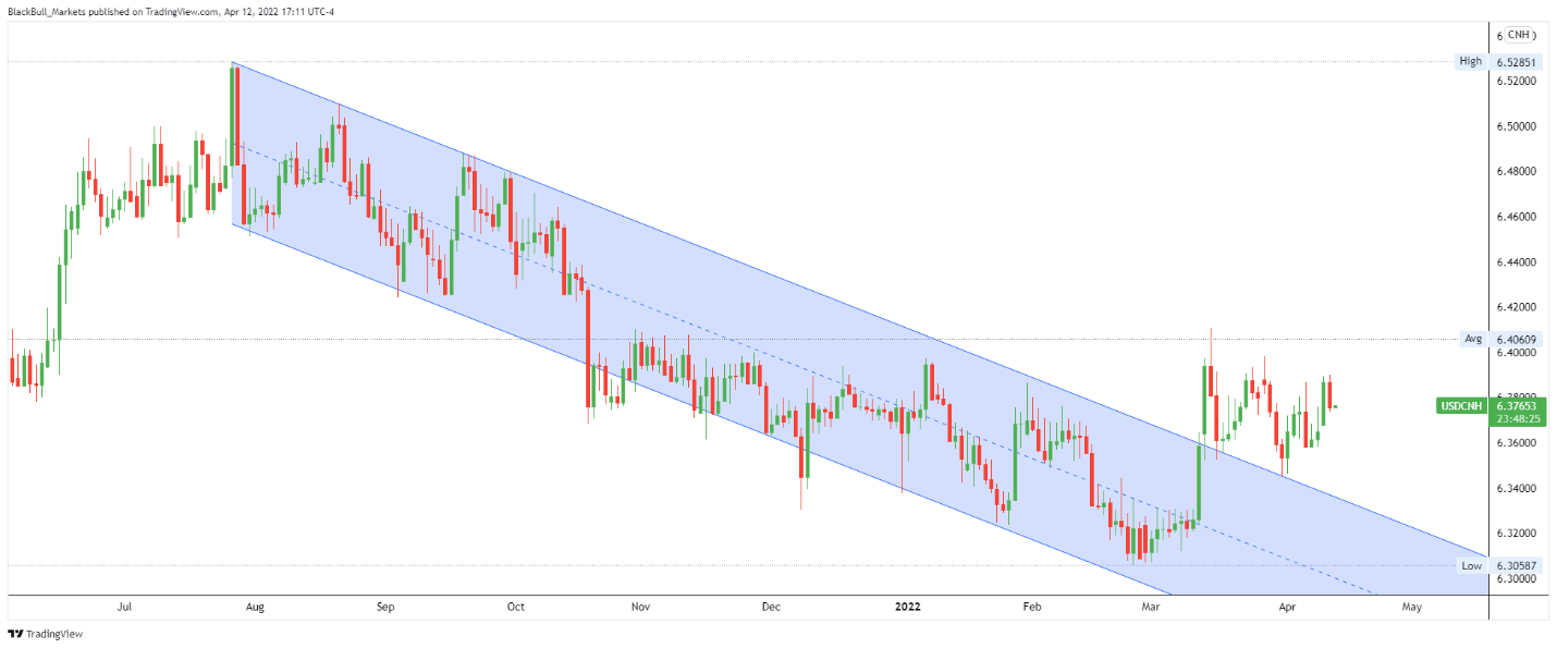 After trending downward for the previous 7 months, news of the extreme lockdowns prompted the USDCNH to break upwards and out of its channel. The USDCNH, at this point, doesn’t have a clear path back to its previous territory.