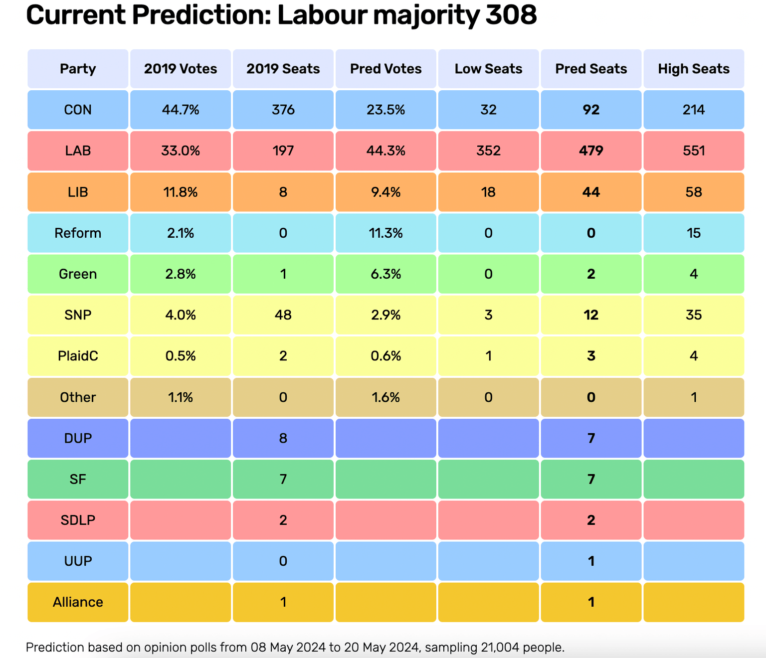 The UK’s “first past the post” voting system tends to unduly reward the winning party when it comes to the alchemy of transforming votes into seats. This means if Labour actually gets 45% of the vote it will win a landslide victory. According to Electoralcalculas, with 44.3% of the vote, Labour would win 479 out of the 650 seats in the UK Parliament – a healthy majority.
