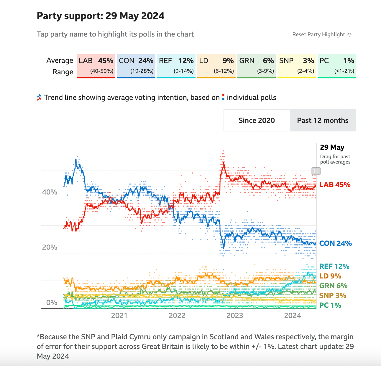 The latest poll by the BBC puts Labour in the lead with 45% and the Conservatives second with only 24% – a 21 percentage-point difference.