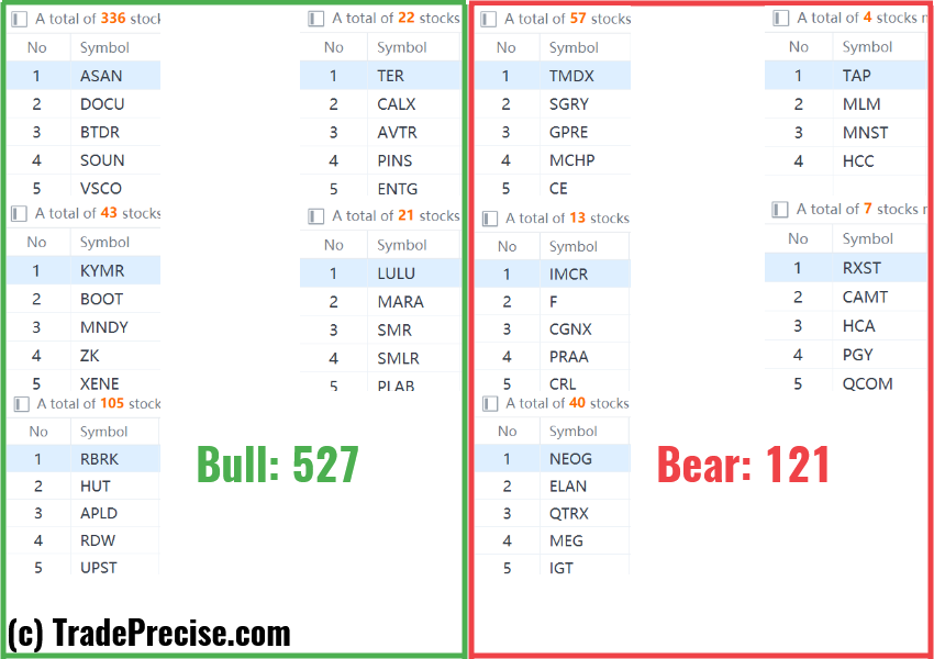 The bullish vs. bearish setup is 527 to 121 from the screenshot of my stock screener below.