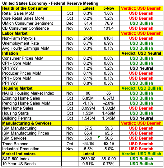 Currency traders should brace themselves for a very busy 24 hours. The list of market moving economic reports scheduled for release is long and includes the Federal Reserve’s monetary policy announcement, US retail sales, EZ and UK PMIs, along with the UK and Canada’s CPI reports. Any one of these reports could set off big moves in FX but collectively there’s serious risk of volatility, divergences and trend reversals. Over the past month, the US dollar has fallen steadily to 2.5 year lows against the euro, Swiss Franc, Canadian, New Zealand and Australian dollars. The ongoing pandemic and lack of additional fiscal stimulus has drawn investors out of the greenback and sparked expectations for Fed easing this month.