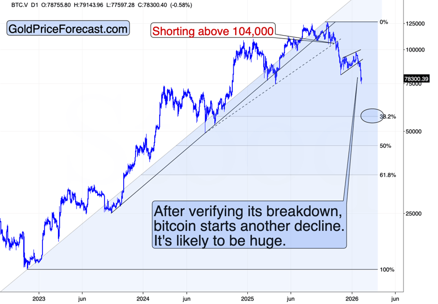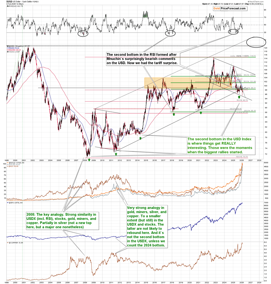 And when it rallies and holds above 100 – it will be then, when the big moves in multiple markets start. At least that’s my take on it, as 100 is not just a very round number. It’s also where we have the rising, long-term support line which was briefly broken in the past – and each time the USD Index then rallied back above it. The 100 level is also just above the declining resistance line below on the 2025 highs.