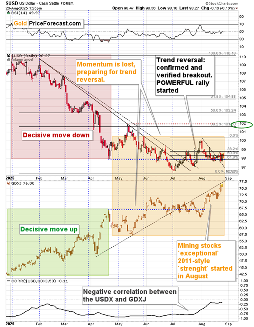 Right now, it’s more difficult to pinpoint the exact day when miners’ ‘strength’ started, as the USD Index is not in a clear uptrend (yet) – it’s moving back and forth with higher short-term lows.