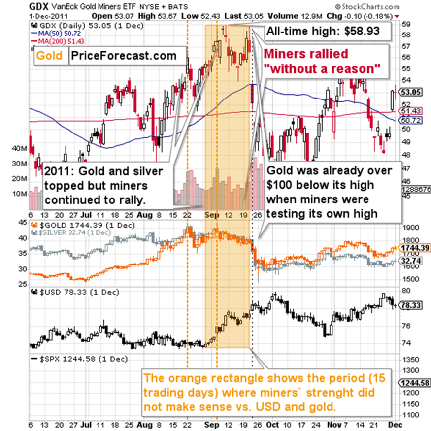 Back in 2011, it was for three weeks – 15 trading days – that miners were moving higher despite the move up in the USD Index. That’s how long the irrational strength persisted. This was all erased in a single session, which was then followed by even more declines that erased weeks of gains in a matter of days.