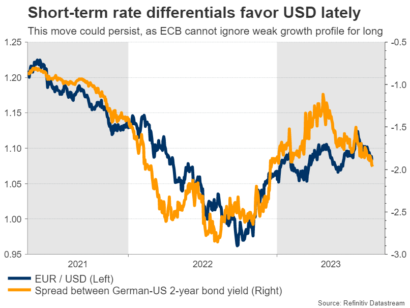 Markets are currently pricing in the first ECB rate cut in almost one year, which seems unrealistic judging by the mounting recession risks. If there is a repricing in the bond market to bring this timeline forward as the economy loses steam, that could drag European yields lower, dealing a serious blow to the euro.