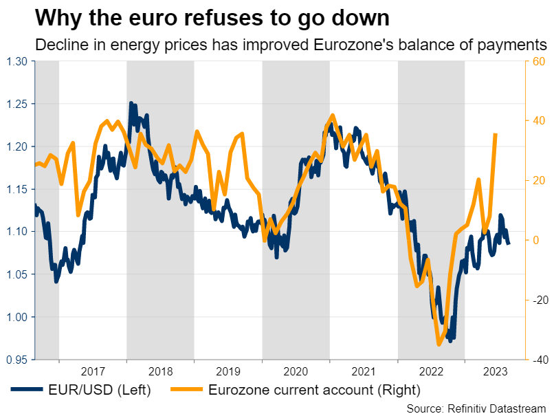 With the energy crisis raging last year, the Eurozone suddenly flipped into a current account deficit, which in turn left its marks on the euro. But with oil and gas prices falling from those extreme highs, Europe has regained its surplus, helping the euro stand back on its feet.